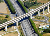 Beam bridges are the simplest kind of bridge. A beam bridge is usually supported by a “pier” at each end, with a beam stretching across them. The weight of the beam pushes down on the piers, and the weight of cars or anything that will cross the bridge pushes down on the beam. Both the beam and the piers must be strong enough to support the weight that will be put on them. Beam bridges are often built over highways, rivers, and valleys. However, they cannot stretch across very long distances, since they are only supported by the piers at the ends of the beam, with nothing supporting the center. To make longer bridges, lots of beam bridges can be linked together in a row; each beam is still supported by a pier at each end.