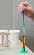 4. Fill the dropper with water from the “ocean” test tube. This time, very gently and carefully add it to the graduated cylinder so that the force of the water being squeezed out of the dropper doesn’t mix the two waters. Add about the same amount of “ocean water” to the graduated cylinder as there is “Great Salt Lake water.” Rinse out the dropper with faucet water.